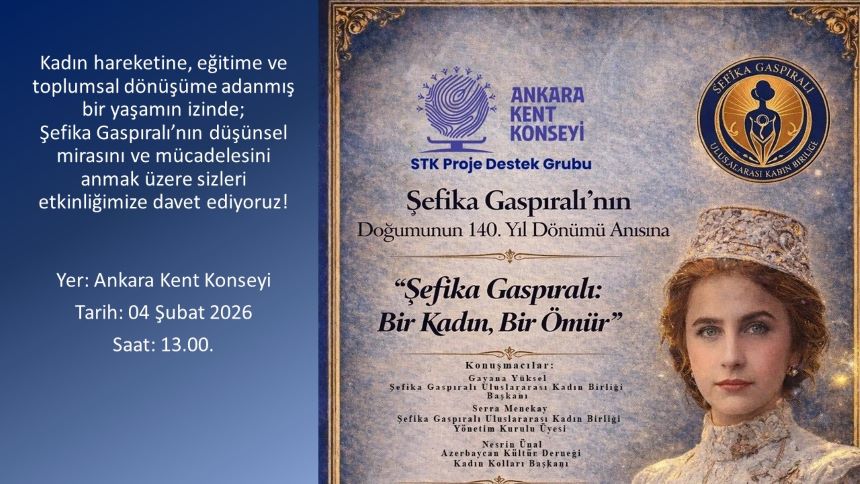 Şefika Gaspıralı’nın doğumunun 140. yıl dönümü vesilesiyle 4 Şubat 2026 tarihinde gerçekleştirilecek olan “Şefika Gaspıralı: Bir Kadın, Bir Ömür” adlı programa, Ankara Kent Konseyi ile Şefika Gaspıralı Uluslararası Kadın Birliği davet ediyor.
